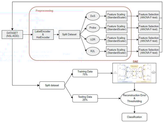 This visual representation illustrates a comprehensive schematic of the architecture that we used in this paper using the NSL-KDD dataset (described in Section 3.1), a well-known dataset used for evaluating systems based on machine learning and deep learning. Specifically, focusing on the process of data preprocessing, it delineates multiple stages essential, progressing through encoding labels with “Label Encoder” and “Hot Encoder”, indicating the conversion of categorical data into a structure suitable for input into the model. In addition, we employed the StandardScaler technique for “Feature Scaling” and ANOVA F-test for “Feature Selection”. In addition, we have separated the dataset by class (DoS (denial of service), Probe, U2R (user-to-root), and R2L (remote-to-local)), selecting features for each class, which gives better results than applying them to the whole dataset.