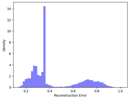 A study of the suggested model’s performance results is given in this section. Initially, optimal hyper-parameter values were chosen, resulting in the configuration of the final model with the ReLU activation function for the input layer and Softmax for the output layer. Our model was trained and set up utilizing Adam optimizer, with mean squared error as the loss function. After this, the mean square error (MSE) was determined between the reconstructed and the input data. Subsequently, an optimal threshold was estimated to isolate normal data and anomaly data. The reconstruction error distribution generated in our application is displayed in Figure 6. It is a well-organized diagram that visually represents a plot, with its main emphasis on the relationship between data density and reconstruction error. The values situated between 0.2 and 0.4 on the reconstruction error axis imply that most of the errors fall within this range; this could suggest that the majority of reconstructions were relatively accurate.