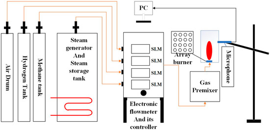 The fault combustion voiceprint test platform used in the research is shown in Figure 1, which consists of four parts. The first part is the material platform. The platform primarily includes air tank (providing a stable oxygen supply); hydrogen tank (main test gas); methane tank (responsible for igniting hydrogen flame and avoiding flameback); steam generator (inhibiting hydrogen combustion rate) and its storage tank; electronic gas flowmeter; and its control switch. The second part is the transportation pipeline platform, which is divided into two sides. One side is the gas pipeline input to the gas flowmeter, which is gradually adjusted to the required ratio and working condition through the gas flowmeter. The other side is the premixer, which premixes the gas in advance and fully premixes the gas to make it fully burn, wherein the burner is a 4 by 4 array burner with a burner tube diameter of 2 cm and a spacing of 5 cm between tube diameters. The gas fuel flow is measured by a flowmeter with an accuracy of ±1%, and its range is 0–300 SLM. Here, SLM is used to represent the flow rate per minute in standard conditions (0 °C, 1 atm). The accuracy of the device for measuring air is ±1%, and the range is 0–300 SLM gas flowmeter. SLM is a unit used to express liters per minute at standard conditions (0 °C, 1 atm). The third part is the combustion chamber, which contains an array burner in the middle. The last part is the voiceprint test platform, including the microphone acquisition device (using rode’s microphone, the model is RODE NT g4+, which can better suppress external noise), camera, data acquisition card (DAQ), computer, and a connecting cable. In order to avoid overheating the microphone, the microphone is 50 cm away from the flame center. Also, in order to ensure the accuracy and reliability of the experiment, the location of all the equipment was kept as unchanged as possible. There is an observation port on the side, which is convenient for observing the combustion state. The ventilation pipe is connected to the flue mouth to exhaust smoke in time. In this study, all equipment except microphones and computers were customized and produced in Beijing, China.