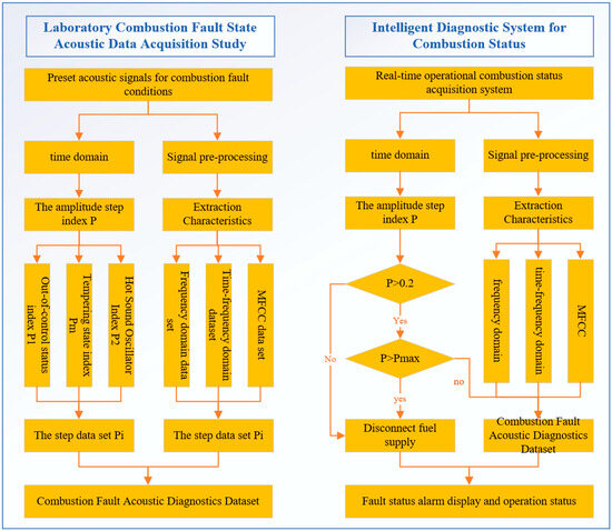 The voiceprint intelligent diagnosis system studied in this paper is mainly divided into two steps. The detailed research route is shown in Figure 2. The first step is the laboratory combustion fault voiceprint data acquisition research. Through the laboratory preset combustion fault sound signal, the amplitude step index P and the corresponding voiceprint features are calculated and extracted. In this experiment, there are three states: pre-set and experimental, flameout state (distinguished from the state of non-ignition, which is transformed from combustion state or combustion fault state), and the thermoacoustic oscillation and flameback state. After the acquisition, the corresponding indexes are calculated respectively to form a step data set. By calculating the step index, it provides a data basis for the intelligent diagnosis system to judge whether to disconnect the combustion. At the same time, the sound signal of the fault state is preprocessed by noise reduction, and the frequency domain, time–frequency domain, and MFCC voiceprint features are extracted and constitute the data set of combustion fault voiceprint diagnosis as a whole. The second step is to run the combustion state diagnosis system in real time. The acoustic signal of combustion fault preset by the laboratory is used as the diagnostic training set, and the real-time acquisition signal is used as the test signal. The size range and various characteristics of P are judged separately, and multiple signal characteristics are fused to obtain the final combustion state and determine whether it is necessary to alarm.