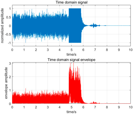 The amplitude step index P, as the most important basis for fault diagnosis in this study, has the following characteristics. As shown in Figure 3, when thermoacoustic oscillation occurs during combustion, it has the following characteristics: First, when a combustion fault occurs, the amplitude of the time-domain signal reaches the limit of the device test; during normal combustion, the time-domain signal will remain within the device test limit. The second envelope value remains between 0 and 1 before the thermoacoustic oscillation occurs; when the thermoacoustic oscillation occurs, some signals will break through the limit of 1, but the duration is less than 0.1 s. When the thermoacoustic oscillation occurs, the envelope value will remain within the range of 0.3–2 and last for more than 0.1 s. As shown in Figure 3 and Figure 4, when flameback occurs during the combustion process, it also has the following characteristics: the first time-domain signal reaches the limit value of the equipment test, and the normal combustion is maintained within the equipment test limit, similar to the thermoacoustic oscillation time-domain signal. When the second envelope value is not tempered, its state is more stable than the thermoacoustic oscillation, and its value remains between 0 and 1; during the combustion flameback, the maximum value of the envelope value abruptly changes to more than 2, and the change in the value is maintained between 0 and 2.