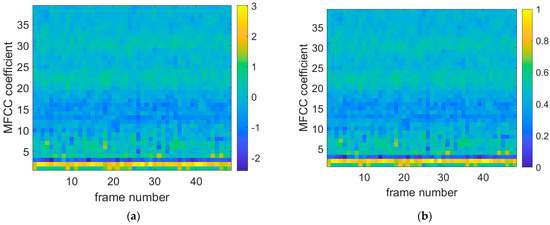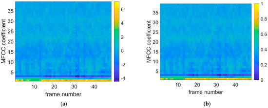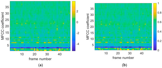 Normal combustion MFCC data diagram. (a) The original MFCC data of stable combustion; (b) stable combustion normalized MFCC data map.