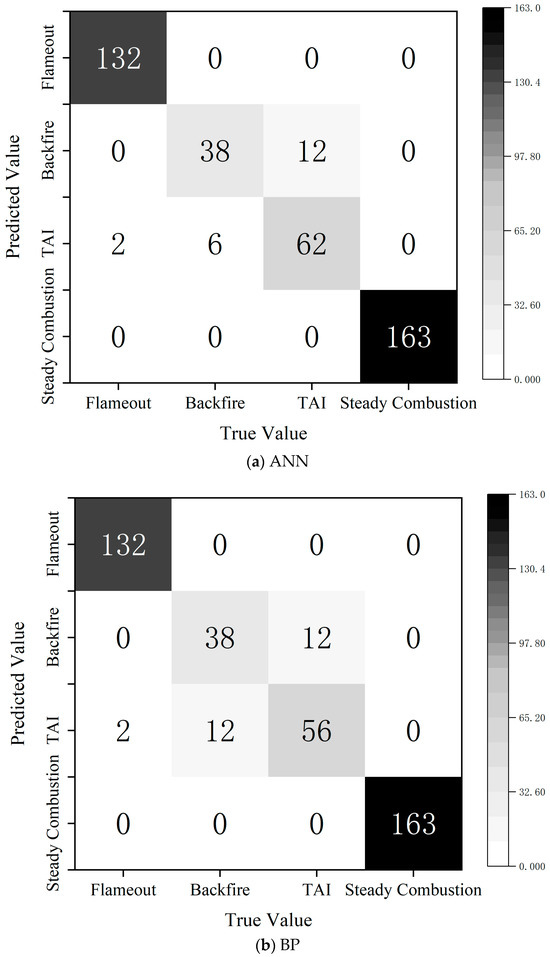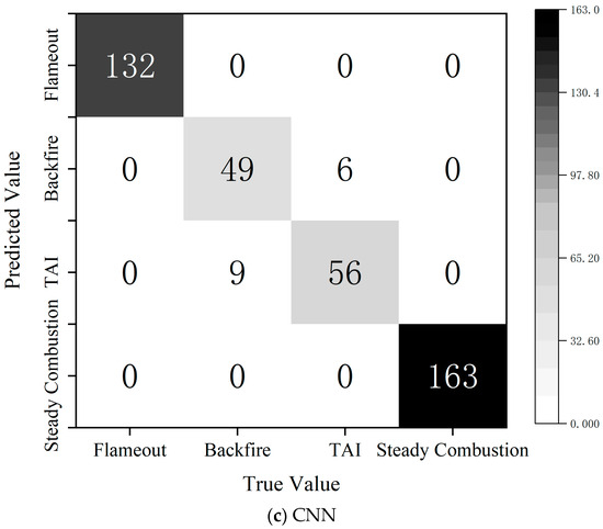 In this study, three models of CNN, BP neural network, and ANN were used to classify and diagnose the four states of flameout, flameback, thermoacoustic oscillation, and stable combustion, and the performance of each model was compared and analyzed by confusion matrix. On the whole, the confusion matrix of the CNN shows that its classification ability is the best, the recognition rate is the highest on flameback and thermoacoustic oscillation, and it has excellent feature extraction and diagnosis ability. Both ANN and BP have a certain degree of misjudgment in the classification of flameback and thermoacoustic oscillations. Among them, BP has the highest number of misjudgments of thermoacoustic oscillations, indicating that its ability to distinguish complex categories of diagnosis is relatively weak. The final results show that CNN has the best diagnostic performance, and its training convergence speed is fast and stable. The CNN model can accurately distinguish between various combustion states, achieving a diagnostic accuracy as high as 93.49%. In comparison, although the BP neural network possesses some diagnostic capability, it suffers from a slow convergence speed, significant training fluctuations, and a high misclassification rate between flameback and thermoacoustic oscillation. The ANN model performs slightly better than BP in classifying thermoacoustic oscillation, but its overall generalization ability remains weak. All models are able to correctly identify flameout and stable combustion states; however, distinguishing between flameback and thermoacoustic oscillation remains the main challenge. A comprehensive analysis indicates that the CNN model demonstrates the best applicability for this monitoring task. The advantages and disadvantages of model diagnosis are shown in Figure 12 and Table 3.