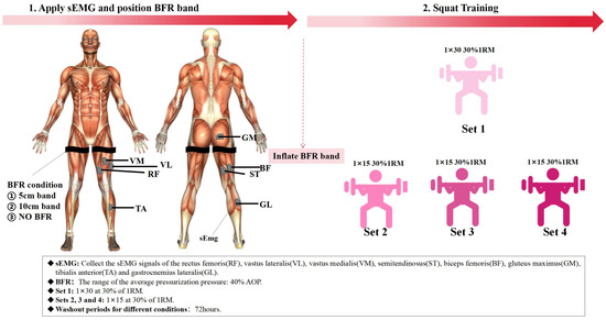 Although previous studies have examined the effects of BFRT on strength development and muscle adaptation, research on the impact of cuff width on training outcomes remains limited, particularly regarding its influence on muscle activation patterns. Moreover, most existing investigations have focused on the macroscopic effects of BFRT, with few addressing the underlying neuromuscular control mechanisms or incorporating time–frequency analyses of muscle coordination. The application of muscle synergy analysis under BFRT conditions, particularly in time–frequency domains, remains underexplored. In light of these gaps, the present study aims to investigate how different cuff widths modulate time–frequency muscle synergy patterns during back-squat movements, using a WPT-NNMF framework to reveal potential neuromuscular control adaptations associated with varying compression conditions.
