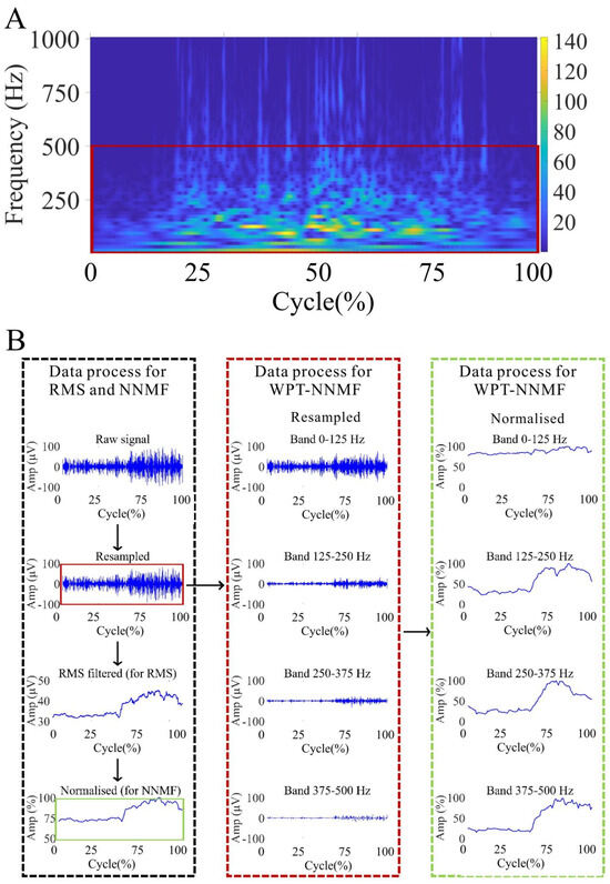 The data were analyzed using NNMF and WPT-NNMF. The sampling frequency of the raw signal was set at 2000 Hz, which is sufficiently higher than the physiological frequencies of muscle activity. Without appropriate frequency band selection, some high-frequency components extracted by WPT-NNMF could lack physiological relevance. Therefore, in the pre-processing stage, it was necessary to determine the effective frequency range for targeted analysis. To achieve this, continuous wavelet transform (CWT) was performed on each raw sEMG signal using MATLAB 2022a, with the “dmey” wavelet selected as the mother wavelet (center frequency = 0.6634 Hz). A two-level decomposition was applied, yielding four sub-bands with a frequency resolution of 125 Hz. The center frequencies of the resulting sub-bands were 62.5 Hz, 187.5 Hz, 312.5 Hz, and 437.5 Hz, respectively. The scalograms revealed that the energy of the sEMG signals in almost all datasets was predominantly concentrated below 500 Hz. This observation informed the selection of the 0–500 Hz frequency band for further analysis. Moreover, the dominance of EMG energy below 500 Hz aligns with known physiological characteristics, as frequencies above this threshold are more likely to represent noise and artifacts rather than meaningful muscle activity [34,35]. Consequently, focusing on the 0–500 Hz band enhances the biological interpretability of the extracted muscle synergies. A representative CWT scalogram from one participant is shown in Figure 2A.