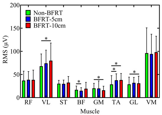RMS results of sEMG signals during BFRT, where green, blue, and red represent Non-BFRT, 5 cm-BFRT, and 10 cm-BFRT, respectively, for the RMS values of eight muscles. Abbreviations: RF: rectus femoris, VL: vastus lateralis, ST: semitendinosus, BF: biceps femoris, GM: gluteus maximus, TA: tibialis anterior, GL: gastrocnemius lateralis, VM: vastus medialis. * indicates statistically significant difference between conditions (p < 0.05).