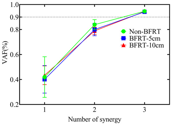 In Non-BFRT, BFRT-5 cm, and BFRT-10 cm squat conditions, three synergy modules were extracted using NNMF. The Friedman test indicated that there were no significant differences in the number of synergy modules among the three conditions(Figure 4).