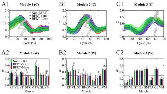 Synergy modules in squats under different BFRT conditions based on NNMF. (A1–C1) Activation coefficients of the three synergy modules. (A2–C2) Muscle synergy vectors of the three modules. * Significant differences between groups were identified using paired t-tests with Bonferroni–Holm correction following repeated-measures ANOVA (p < 0.05).