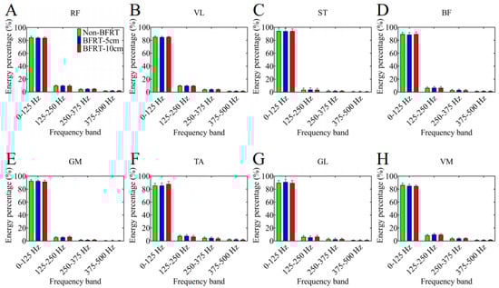 The energy percentage of each muscle in different frequency bands. Subfigures show results for: (A) RF—rectus femoris, (B) VL—vastus lateralis, (C) ST—semitendinosus, (D) BF—biceps femoris, (E) GM—gluteus maximus, (F) TA—tibialis anterior, (G) GL—gastrocnemius lateralis, and (H) VM—vastus medialis.