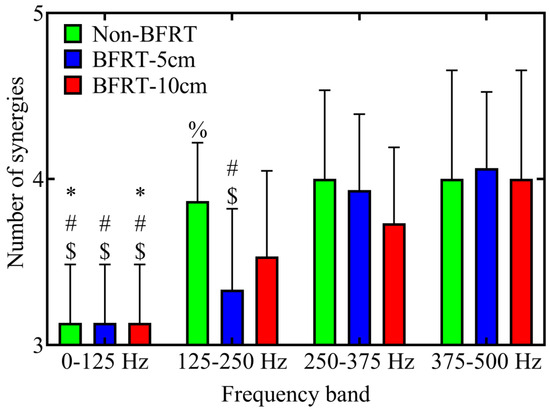 Compared to the 0–125 Hz frequency band, the number of muscle synergies significantly increased in Non-BFRT at 125–250 Hz (3.13 ± 0.35 vs. 3.87 ± 0.35, p < 0.001), 250–375 Hz (3.13 ± 0.35 vs. 4.00 ± 0.53, p < 0.001), and 375–500 Hz (3.13 ± 0.35 vs. 4.00 ± 0.65, p < 0.001). Similarly, in BFRT-10 cm, muscle synergy numbers were significantly higher in the 125–250 Hz (3.13 ± 0.35 vs. 3.53 ± 0.52, p = 0.047), 250–375 Hz (3.13 ± 0.35 vs. 3.73 ± 0.46, p = 0.001), and 375–500 Hz (3.13 ± 0.35 vs. 4.00 ± 0.65, p < 0.001) frequency bands. Under BFRT-5 cm, the number of synergies was significantly higher in the 250–375 Hz (3.93 ± 0.46 vs. 3.13 ± 0.35, p < 0.001) and 375–500 Hz (4.00 ± 0.65 vs. 3.13 ± 0.35, p < 0.001) frequency bands compared to 0–125 Hz. Additionally, within the 125–250 Hz frequency band, BFRT-5 cm exhibited a significantly lower number of synergies than Non-BFRT (3.86 ± 0.35 vs. 3.33 ± 0.49, p = 0.008) (Figure 7).