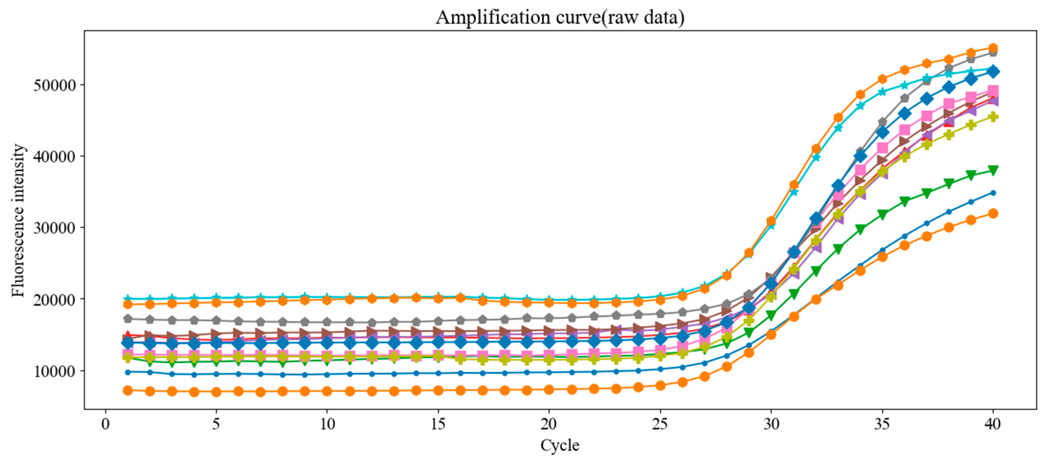 Raw fluorescence amplification curves from 12 replicate PCR runs using the same concentration of Chlamydia trachomatis DNA standard. Despite using identical samples, small variations in Ct values were observed, emphasizing the need for proper baseline correction.