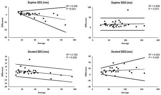 A significant mean bias was observed for supine SD2 without heteroscedasticity or a proportional bias, indicating that the Kairos wristband systematically underestimated ECG-derived values. In addition, 95% LOA were wide (±30.5 ms), and relative and absolute agreement were poor. In the seated position, the Kairos wristband exhibited heteroscedasticity without a proportional bias, resulting in V-shaped LOA. This indicates greater error at higher SD2 compared to ECG-derived values. Relative and absolute agreement were poor.
