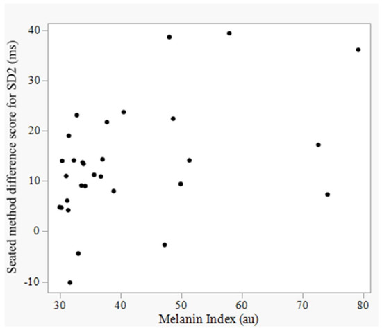 Scatterplot of the association between melanin index and method difference scores (Kairos-derived value – electrocardiography-derived value) for seated SD2. SD2 = standard deviation of points along the line of identity in the Poincaré plot; ECG = electrocardiograph.