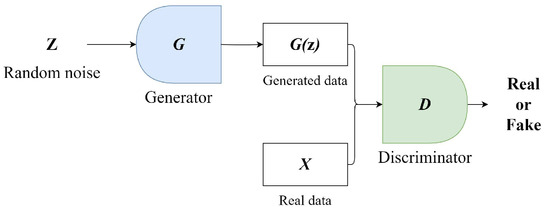 The GAN model was designed by Ian J. Goodfellow in 2014 [27]. GANs consist of two independently operating networks: a generator (G) and a discriminator (D). Figure 3 presents a simplified diagram of a GAN. The goal of the generator network is to learn and mimic the distribution of real data. It begins with a random noise vector z and tries to create samples that resemble real data. The discriminator is a binary classifier tasked with evaluating the output of the generator and differentiating between the fake data produced by the generator and actual real data. During training, the two networks are trained in parallel. The generator strives to produce data that appear more realistic over time, while the discriminator focuses on improving its ability to distinguish between real and fake data. This process involves a minimax game, where the discriminator tries to maximize its accuracy, while the generator aims to minimize the discriminator’s success. The ultimate aim is that through this competitive and learning process, the generator becomes adept at creating high-quality data indistinguishable from real data, while the discriminator becomes proficient at accurately identifying what is real and what is not [27].