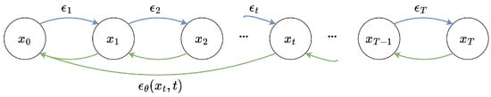 Denoised diffusion probabilistic model. Blue arrows represent the forward diffusion process, green arrows represent the reverse denoising process.
