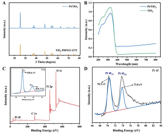 (A) XRD spectra of Pt/TiO2 photocatalyst; (B) UV–Vis DRS spectra of TiO2 and Pt/TiO2 photocatalysts; (C) XPS wide-spectrum of Pt/TiO2 photocatalyst and corresponding narrow scan spectra of Ti 2p; and (D) corresponding XPS narrow scan spectra of Pt 4f.