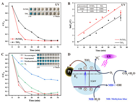 (A) Photocatalytic degradation of MB by TiO2 and Pt/TiO2 under UV irradiation (inset images present photocatalytic degradation of MB solution at different times); (B) first-order kinetics of MB degradation under UV irradiation in TiO2 and Pt/TiO2 systems at different times (inset tables present rate constants and R2 values of all photocatalysts); (C) photocatalytic degradation of MB upon addition of various scavengers under UV irradiation in Pt/TiO2 system; and (D) proposed photocatalytic mechanism of Pt/TiO2 system under UV irradiation.