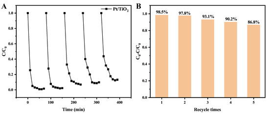 Reusability is crucial for practical wastewater treatment applications. Thus, the recycling performance of the Pt/TiO2 photocatalyst was examined over five consecutive degradation cycles under identical UV irradiation (Figure 4A,B). After each cycle, the catalyst was recovered, washed, and reused. Degradation efficiencies remained above 85% even after the fifth reuse, indicating excellent reusability of the Pt/TiO2 photocatalyst.