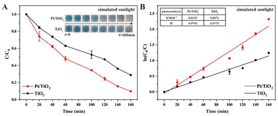 (A) Photocatalytic degradation of MB by TiO2 and Pt/TiO2 under simulated sunlight irradiation (inset images present photocatalytic degradation of MB at different times), and (B) first-order kinetics of MB degradation under simulated sunlight irradiation in TiO2 and Pt/TiO2 systems at different times (inset table presents rate constants and R2 values of all photocatalysts).