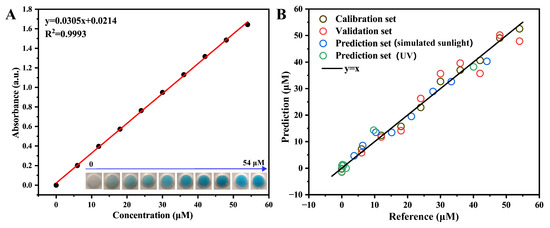 (A) Absorbance–concentration standard curve of MB (inset photos present standard solutions of MB with concentrations ranging from 0 to 54 μM); and (B) RGB-based PLS model for rapid monitoring of MB concentrations.