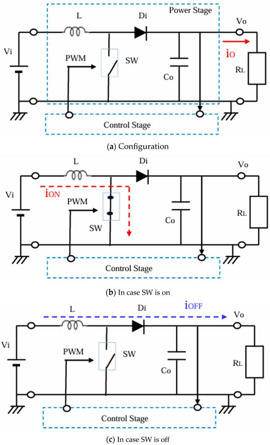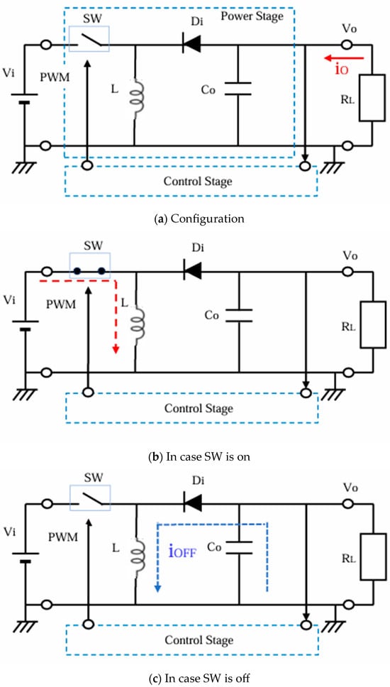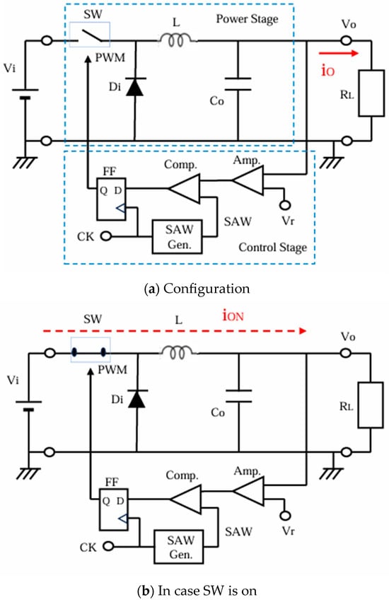 There are three fundamental DC–DC switching converters: buck, boost, and buck–boost types. They are composed of power and control stages, and their configurations are almost the same among the three types. The power stage has a switch, an inductor, a diode, and an output capacitor. However, its construction differs among them; the differences are distinguished by their positions. The control stage of each converter is quite similar, consisting of a comparator, a D-type Flip-Flop (DFF), and a reference voltage. Their voltage conversion ratio (Vo/Vi) and polarity of Vo vary, where Vi represents the input voltage, and Vo represents the output voltage: 0 < Vo < Vi for the buck converter, 0 < Vi < Vo for the boost converter, and 0 < −Vo ≷ Vi for the buck–boost converter.