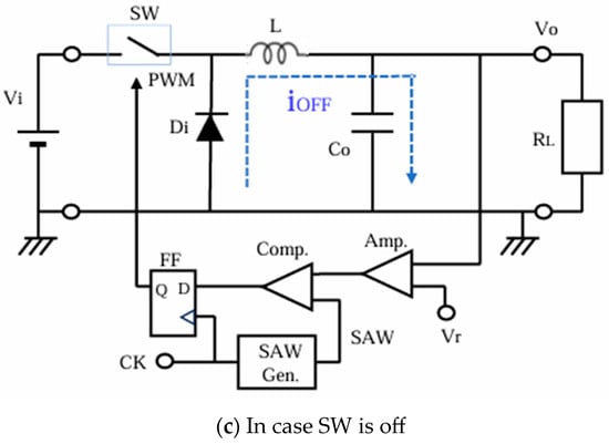 Figure 1 shows the configuration and operation of the buck converter. The power stage is composed of a switch (SW), an inductor (L), a diode (Di), and an output capacitor (Co). The control stage is composed of an amplifier (AMP), a comparator (CMP), a D-type Flip-Flop (DFF), and a sawtooth generator (Figure 1a). The red/blue broken line represents the current flow when the PWM pulse is high/low, respectively (Figure 1b,c).