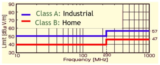 There are several EMI test standards, including the IEC 61,000 series, CISPR 16, EN standards, FCC standards, and VCCI. Electronic appliances must meet these standards, depending on regions and applications [,,]. Figure 5 shows one example of the CISPR regulations.