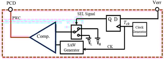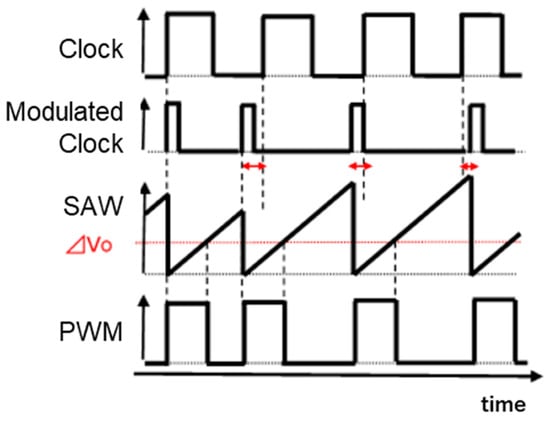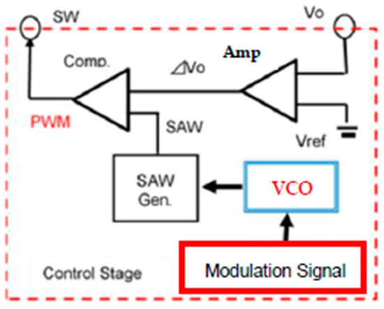 It is recognized that the clock frequency or phase modulation in switching converters spreads the power spectrum of the EMI noise from the PWM signal and decreases its peak level at the clock and harmonics frequencies. Figure 7 illustrates the clock frequency modulator, which replaces the control block in Figure 1 to implement the buck converter with a noise spread spectrum capability. Figure 8 shows its associated signals. There, the voltage-controlled oscillator (VCO) is incorporated for the modulation of the frequency or phase of the SAW signal.