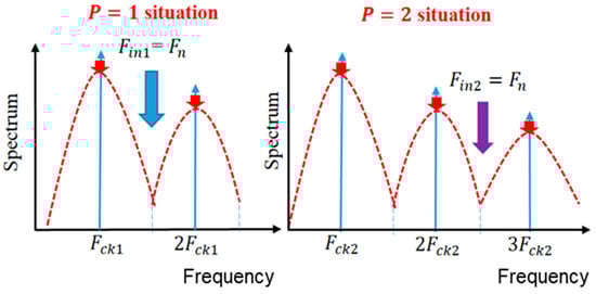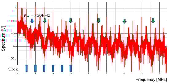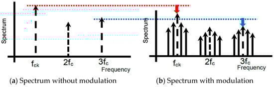 Figure 9a illustrates the spectrum of the PWM signal without clock modulation, whereas Figure 9b illustrates the one with modulation by two frequencies. The clock noise power spectrum is spread around the clock and harmonics frequencies. Several line spectra, indicated by the solid arrows, are discretely spread (marked by the dashed arrows); there, the peak power levels are reduced.