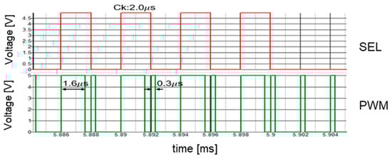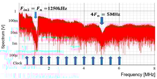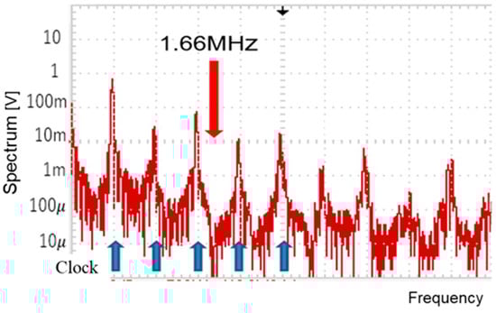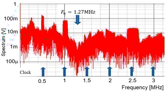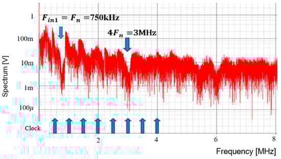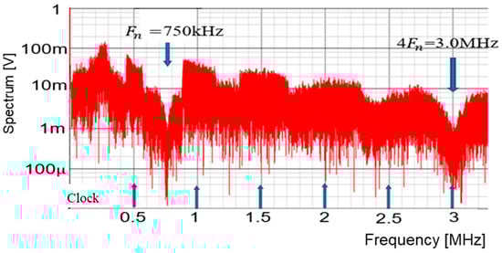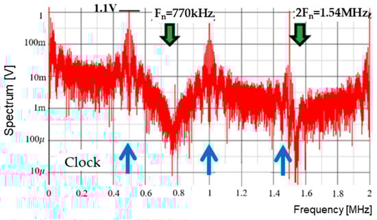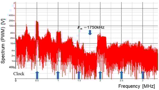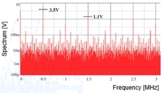 Figure 10 illustrates the spectrum of the PWM pulse without clock modulation. At the clock frequency of 0.5 MHz, a line spectrum reaching 3.5 V is observed, along with many harmonics. For the clock noise reduction, its modulation is utilized by shaking its phase or frequency (Figure 7). Figure 11 displays the spectrum with modulation. Since the power at the clock and harmonics frequencies spread to other bands, their peak levels become lower, though the bottom level becomes higher.