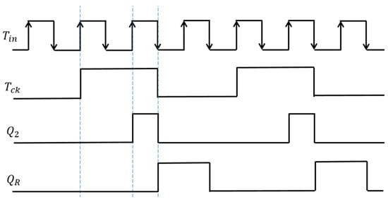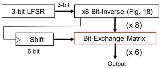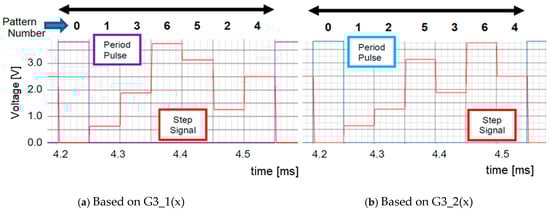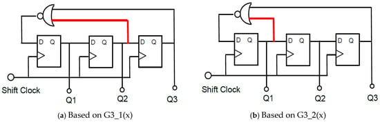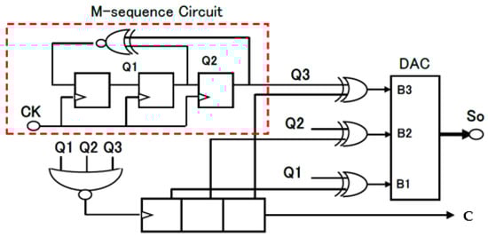 Figure 12 illustrates the 3-bit linear feedback shift registers (LFSRs) or M-sequence circuits. Based on G3_1(x) in Equation (4), the outputs of the 3rd and 2nd bits are connected to the inputs of the Exclusive NOR (EX-NOR) gate, and its output is provided to the first DFF. The n-bit LFSR generates K (=2n −1) levels, where n is the order of the primitive polynomial. For n = 3, K is 7, and there are two primitive polynomials, G3_1(x) in Equation (4) and G3_2(x) in Equation (5).