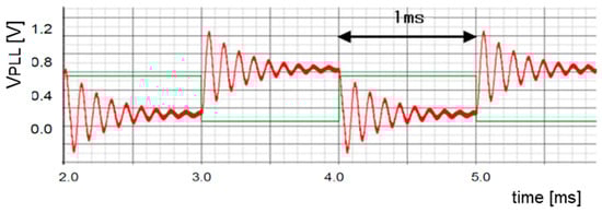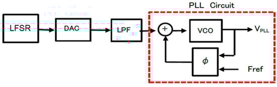 Figure 13 illustrates the analog output levels obtained from (Q3, Q2, and Q1) by the LFSR in Figure 12. There are periodic patterns with seven levels: 0-1-3-6-5-2-4 or 0-1-2-5-3-6-4. These are transformed into a smooth signal as pseudo-analog noise. This pseudo analog noise is introduced into the PLL, and then its output is frequency-modulated (Figure 14). Also, the PLL does not lock to the input noise due to its sluggish step response characteristics (Figure 15).