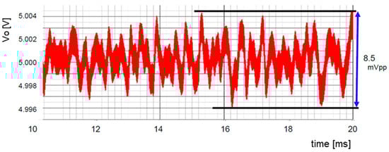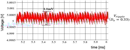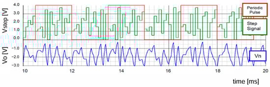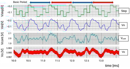 Figure 16 displays the pseudo analog noise (Vn: periodic), the VCO input signal (Vcont: non-periodic), and the output voltage ripple (⊿Vo: non-periodic) when an LFSR based on G3_1(x) is used. The clock frequency is 400 kHz, while the shift clock of the LFSR in Figure 12 is 10 kHz. Then, the periodic frequency of Vn is 1.43 kHz, and ⊿Vo is about 10 mVpp. Table 1 shows the simulation parameters, and SIMPLIS is used as simulator.