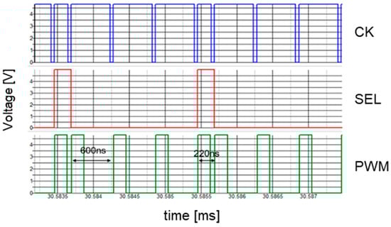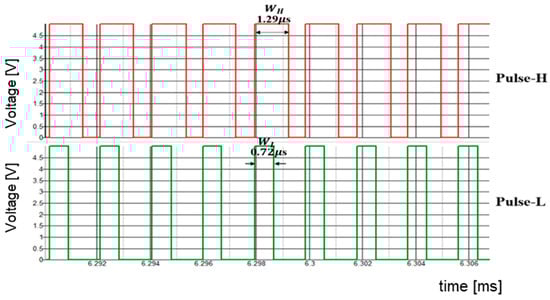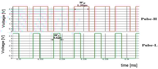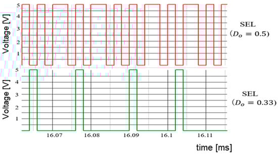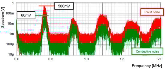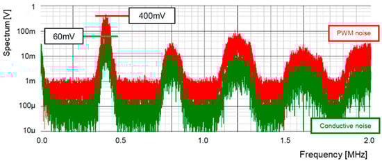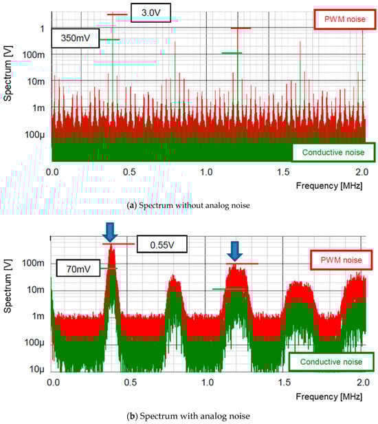Figure 17 displays the simulated spectra of the PWM signal (red) and the conducted noise (green). Figure 17a displays the spectra without the pseudo-analog noise (Np), whereas Figure 17b includes the ones with Np. The peak level at the clock frequency is reduced from 3.0 V to 0.55 V, and that at the 3rd harmonic is reduced from 1.0 V to 0.1 V, while that of the conductive noise is reduced from 350 mV to 70 mV.