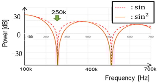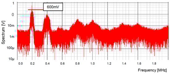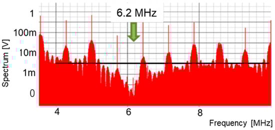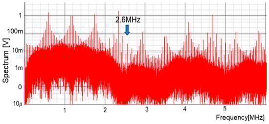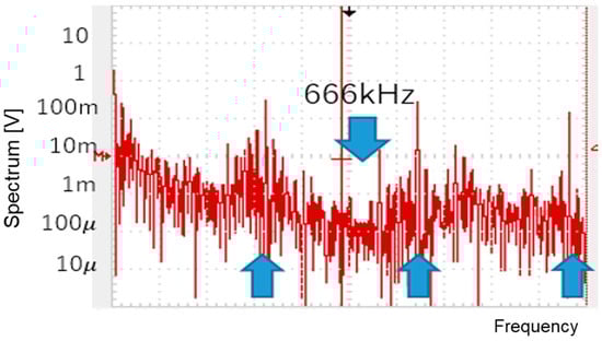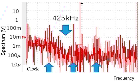 The root cause of these interference noises lies entirely in the switching frequency of the clock pulses that control and drive the power semiconductors, as well as their harmonics. Therefore, we monitored and checked the EMI interference noise generated by these clock pulses. Additionally, we explored new coding techniques for these clock pulses and investigated a clock pulse control method for DC–DC switching power supplies that could produce notch characteristics with significantly reduced noise within specific frequency bands of the resulting EMI noise spectrum (Figure 6c).