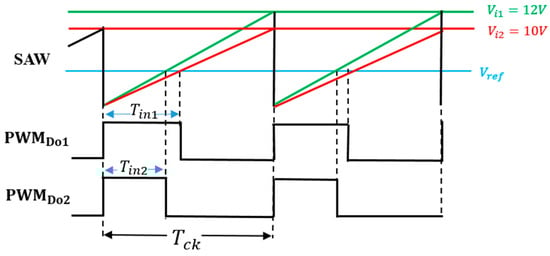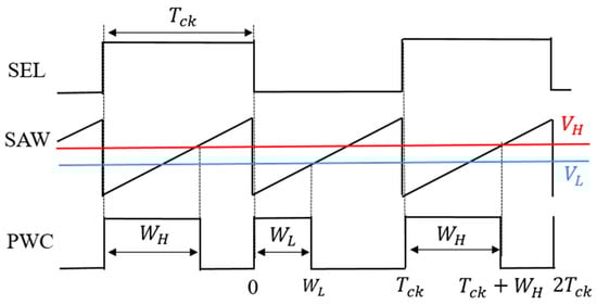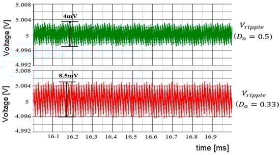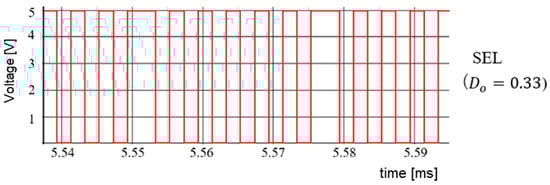 In the power stage, SW is regulated by the PWM signal. In case the PWM signal is high, SW turns ON, and the input current from the power supply flows through SW to L (as shown by the red broken line in Figure 1b). During this period, the input current increases, flowing into Co and RL, resulting in an increase in Vo (Figure 2) and raising the magnetic energy in L. Conversely, when the PWM level is low, SW turns OFF, and the energy stored in L causes the current to flow through Di (as indicated by the blue dotted line in Figure 1c). Then, Vo decreases and the duty ratio (D) of the PWM signal increases.