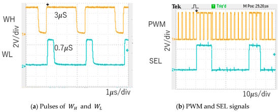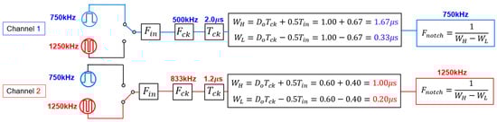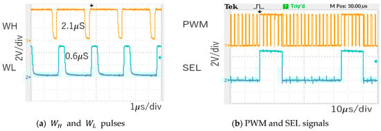 For the second example, P = 1 is used. By changing to 600 kHz, can be automatically adjusted to 400 kHz (). Consequently, and (Figure 82a). The PWM and SEL signals are illustrated in Figure 82b. is calculated as 666 kHz based on Equation (24), and the experimental results show that the observed notch is at 666 kHz (Figure 83), which lies between and .