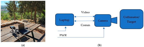 (a) Setup of the outdoor experiments: SCD camera, laptop, batteries; (b) schematic diagram of the setup.