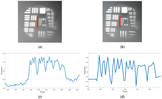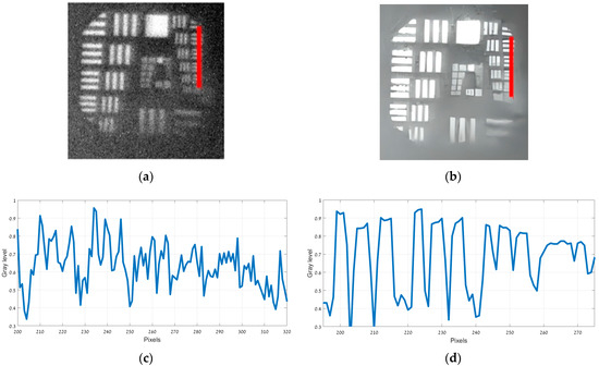 Figure 5a presents the original 150 Kelvin image, while Figure 5b displays its enhanced counterpart. The intensity profiles along the finest bar region (marked in red in both Figure 5a,b) are illustrated in Figure 5c,d. Figure 6a presents the original 180 Kelvin image, while Figure 6b displays its enhanced counterpart. The intensity profiles along the finest bar region (marked in red in both Figure 6a,b) are illustrated in Figure 6c,d.