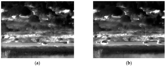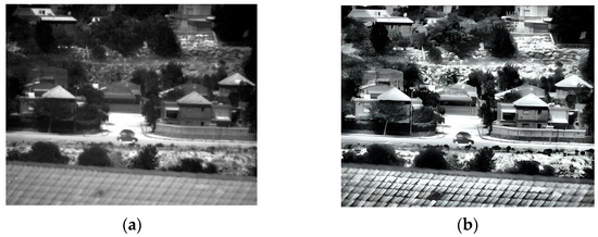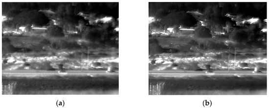 Daylight images (far distance) captured at 150 Kelvin. (a) Original image; (b) after enhancement.