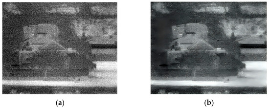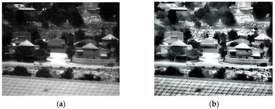 Daylight images (far distance) captured at 180 Kelvin. (a) Original image; (b) after enhancement.