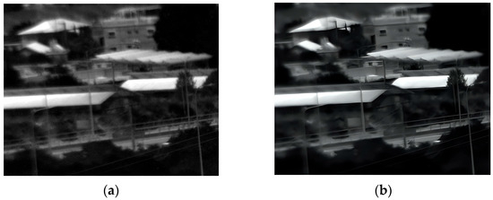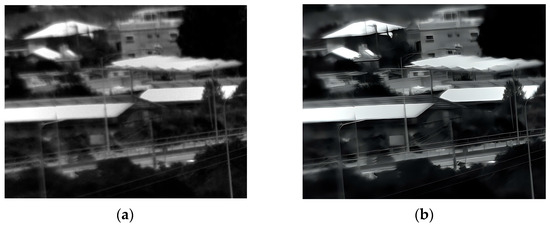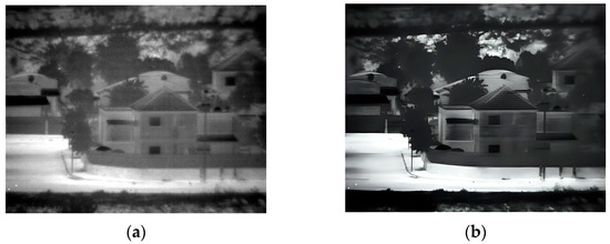 The third experiment took place outdoors in low-light evening conditions, capturing images of buildings, trees, and people. The original and enhanced 150 Kelvin images are shown in Figure 9, and the 180 Kelvin versions in Figure 10. Enhancement reduced blur and revealed more details in both temperature conditions, with the 150 Kelvin image exhibiting superior quality. For instance, Figure 9’s enhanced image clearly shows three people walking on the lower-right sidewalk, who were difficult to discern in the original. However, identifying the individual walking on the sidewalk in Figure 10 remains challenging even after enhancement.