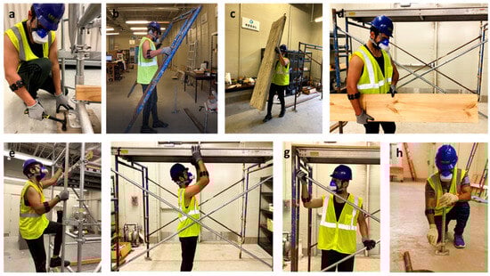 Participants performed different scaffold-building activities. (a) Hammering, (b) carrying scaffold frame, (c) carrying baseboard, (d) carrying guardrail, (e) going up the vertical ladder, (f) installing baseboard on a different level, (g) installing crossbars, and (h) adjusting leveling jacks.