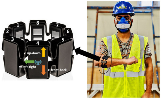 This study proposes to use a forearm-based wearable armband sensor (Myo Armband) developed by Thalmic Lab Inc. (Kitchener, ON, Canada) to collect forearm IMU and EMG data. The armband consists of eight dry EMG surface electrodes and a 9-axe IMU sensor (3-axe accelerometer, 3-axes gyroscope, and 3-axe magnetometer). The IMU sensor is embedded in the EMG channel 4. The EMG electrodes capture the forearm muscle activity and return an 8-bit array of integer values ranging between −128 and 127, acquired at 200 Hz frequency. In contrast, the IMU data capture the forearm’s motion by measuring acceleration, angular velocity, and orientation in x, y, and z-direction at 50 Hz frequency. The real-time raw IMU and EMG data were transmitted from the armband sensor to local computer storage via Bluetooth Low Energy (BLE) wireless connection. To capture the gold standard breath-by-breath oxygen uptake while performing construction activities, a portable metabolic analyzer, the VO2 Master Analyzer (VO2 Master Health Sensor Inc., Vernon, British Columbia, CA, USA), was used, as shown in Figure 2. The metabolic analyzer records VO2 at a frequency of 1 Hz. The armband sensor and metabolic analyzer were calibrated according to the manufacturer’s guidelines. As shown in Figure 2, the armband is required to be worn at the thickest part of the forearm during the experiment, and the blue Myo logo needs to be located at the lower forearm with the EMG channel 1–4 in the line of the index finger of the participant [21].