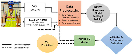 The proposed framework to develop an oxygen uptake prediction model using forearm-based IMU and EMG data is shown in Figure 3. The raw IMU and EMG data obtained from the armband sensor were preprocessed and synchronized with the oxygen uptake recorded using a VO2 analyzer. The preprocessed data were used to train the BiLSTM-based regression model and evaluated using the Leave-One-Subject-Out (LOSO) cross-validation. Furthermore, the trained model was used to predict the oxygen uptake on unseen data to estimate the VO2 required to build one scaffold unit.
