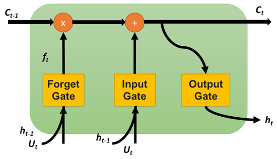 RNN is a type of neural network suitable for sequence data. In RNNs, the recurrent layers store the information from the previous step and combine it with the future timestamp input. Once all the time steps are evaluated, the output layer generates output using the activation function. The output error generated is backpropagated to the network for updating the weights during training and continues until the error is minimized [56]. The most commonly used RNN models for time-series problems are LSTM, BiLSTM, and gated recurrent unit (GRU) [57]. An LSTM cell consists of three gates: input, forget, and output gate, as shown in Figure 4. The input from the previous hidden state and the current input will be sent to these three gates, and the outputs from these are passed to the cell state, which carries the required information. The gates are the neural networks responsible for retaining or removing the information during the training [58]. A BiLSTM-based recurrent neural network is a variation of a long-short-term memory (LSTM) model that consists of a backward and forward LSTM layer to learn information from the past layer [59]. It duplicates the first LSTM layer so that the two layers are trained side-by-side on all the available input data in the past and future timestamps. The combination of backward and forward LSTM layers helps understand the long-term dependencies between the time steps of the sequence data to improve the model performance [60,61,62].