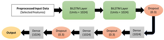 In this study, the proposed BiLSTM models were implemented in Keras [63], a high-level neural networks API written in Python 3.9.0 and capable of running on top of TensorFlow. The proposed BiLSTM model’s architecture consists of two stacked BiLSTM layers, dropout layers, dense layers, and an output layer, as shown in Figure 5. The data obtained from the preprocessing step were used as input data for the model. The input data consisted of 52,631 samples with 69 features for 10 participants and were reshaped to three-dimensional input for LSTM models, which is in the format of [samples, timestamps, features]. The reshaped input sequence data were fed into two stacked BiLSTM layers with 1024 neurons. The BiLSTM layers’ output was passed through a Dropout (0.3) layer to randomly drop 30% units from the network to prevent overfitting of the model. Later, the data were passed through a series of fully connected dense layers (1024) and a dropout layer (0.3) before reaching the output layer. Since the regression model’s output is a numerical value, no activation function is applied in the final output layer. The hyperparameters such as the number of layers, neurons, optimizers, batch size, and the number of epochs were chosen using the random search hyperparameter optimization technique [64]. An Adam optimizer with a learning rate of 0.001 and a mean square error (MSE) loss function was used to compile the model. An early stopping method with 100 epochs was used to fit the model. The early stopping method helps prevent the model overfit by stopping the training process if there is no improvement in the metrics.