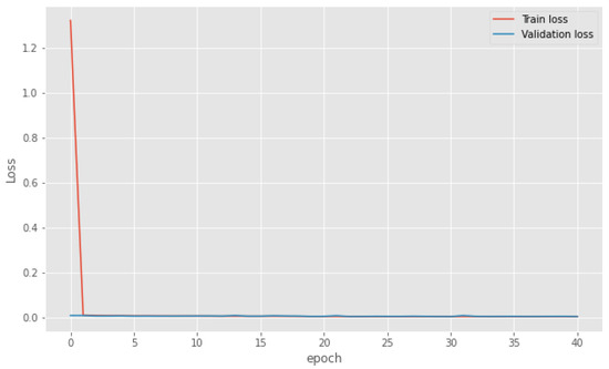 This section presents the LOSO cross-validation results of the proposed BiLSTM-based regression model using IMU and EMG features. The proposed model was built using 10 participants’ data and 69 selected IMU and EMG features. The average metrics of 10-fold LOSO cross-validation metrics shows are shown in Table 3. The average R2, RMSE, and MAE values of the proposed model for all the participants are 0.80, 1.257 mL·kg−1·min−1, and 1.581 mL·kg−1·min−1, respectively. Moreover, Table 3 presents the LOSO cross-validation results on test Subject#1, where R2, RMSE, and MAE are 0.75, 1.685 mL·kg−1·min−1, and 1.264 mL·kg−1·min−1. The measured and predicted oxygen consumption for each second on Subject#1 test data are shown in Figure 6. From Figure 6, it can be observed that the model has predicted the pattern perfectly, but some of the extreme values were missed. Even though the desired results are achieved, it is essential to assess the training performance using learning curves to understand whether the model is suffering from variance or bias [66]. Figure 7 shows that the proposed model loss function (i.e., MSE) decreased with the number of epochs. Moreover, the training and validation loss curves are close to each other, showing that the model has a good fit with low bias and variance.