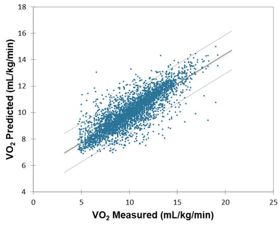A further trained model was used to predict oxygen consumption on the unseen data (i.e., participants performed an entire sequence of activities to build one unit of scaffold frame). The unseen dataset consists of 4116 number samples from all the participants. The average R2, RMSE, and MAE on unseen data of all participants are 0.75, 1.685 mL·kg−1·min−1, and 1.264 mL·kg−1·min−1. Figure 8 shows the linear correlation analysis for measured and predicted VO2. It should be noted that these results are from second-by-second oxygen uptake predictions.