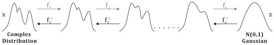where represents the Jacobian of the reversed normalizing flow. In practical applications, a single invertible transformation is usually insufficient; hence, the flow model must be implemented by stacking numerous layers of invertible transformations. Figure 1 illustrates the process of this cascade transformation. The formula can be expressed as below (5).